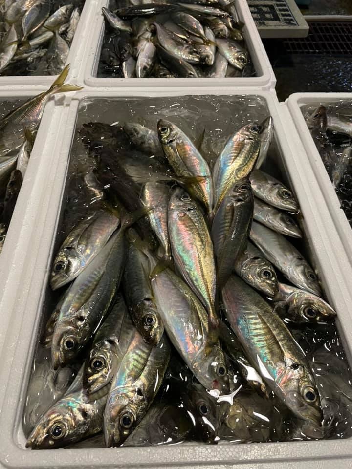 おはようございます😃 うまいもの市場です。 (南足柄市のスーパーふるぎや鮮魚ら 本日の小田原漁港の水揚げは サザエ、カツオ、水カマス、あじ、小さば 他少々です。 全体的に少ない状況です😵 こっちのほうではあまり見かけない魚を発見😳 さて、何でしょう⁉️ 写真2枚目の手で持ってる魚です🐟 #うまいもの市場 #小田原 #魚 #魚市場 #漁港