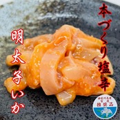 原材料名:いか、明太子、米糀、食塩、調味料(アミノ酸等)、ソルビット、酒精、増粘多糖類、パプリカ色素、(原材料の一部に小麦、大豆を含む)
