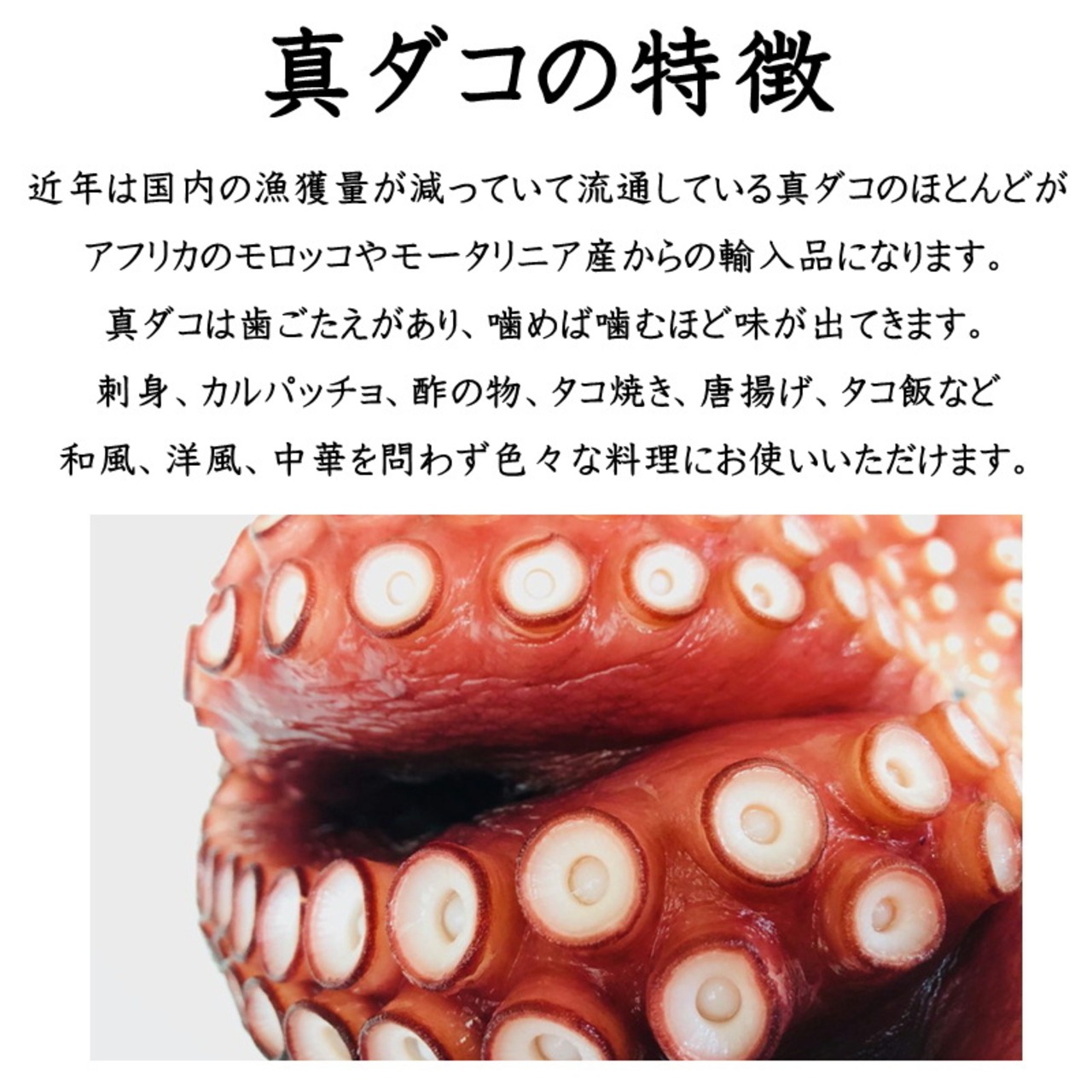 ・原材料名:蛸(モロッコ・モーリタニア産)、食塩、酸化防止剤(エリソルビン酸Na、亜硫酸塩)、ミョウバン、pH調整剤