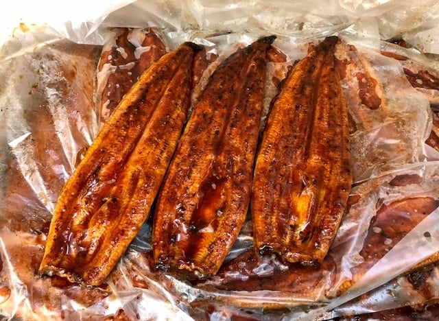 原材料名:うなぎ(中国産)、醤油、砂糖混合異性化液糖、みりん、砂糖、増粘剤(加工でん粉、増粘多糖類)、着色料(カラメル、モナスカス、クチナシ)、酒精、調味料(アミノ酸等)、(原材料の一部に小麦、大豆を含む)