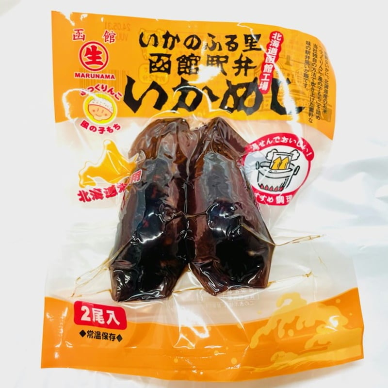 原材料名:いか(輸入又は国産)、米(うるち米(北海道))、醤油、砂糖、発行調味料、風味原料(昆布、鰹、椎茸)、魚介エキス、食塩、オリゴ糖、昆布エキス、水あめ/トレハロース、着色料(カラメル)、調味料(アミノ酸等)(一部に小麦・大豆・いかを含む)