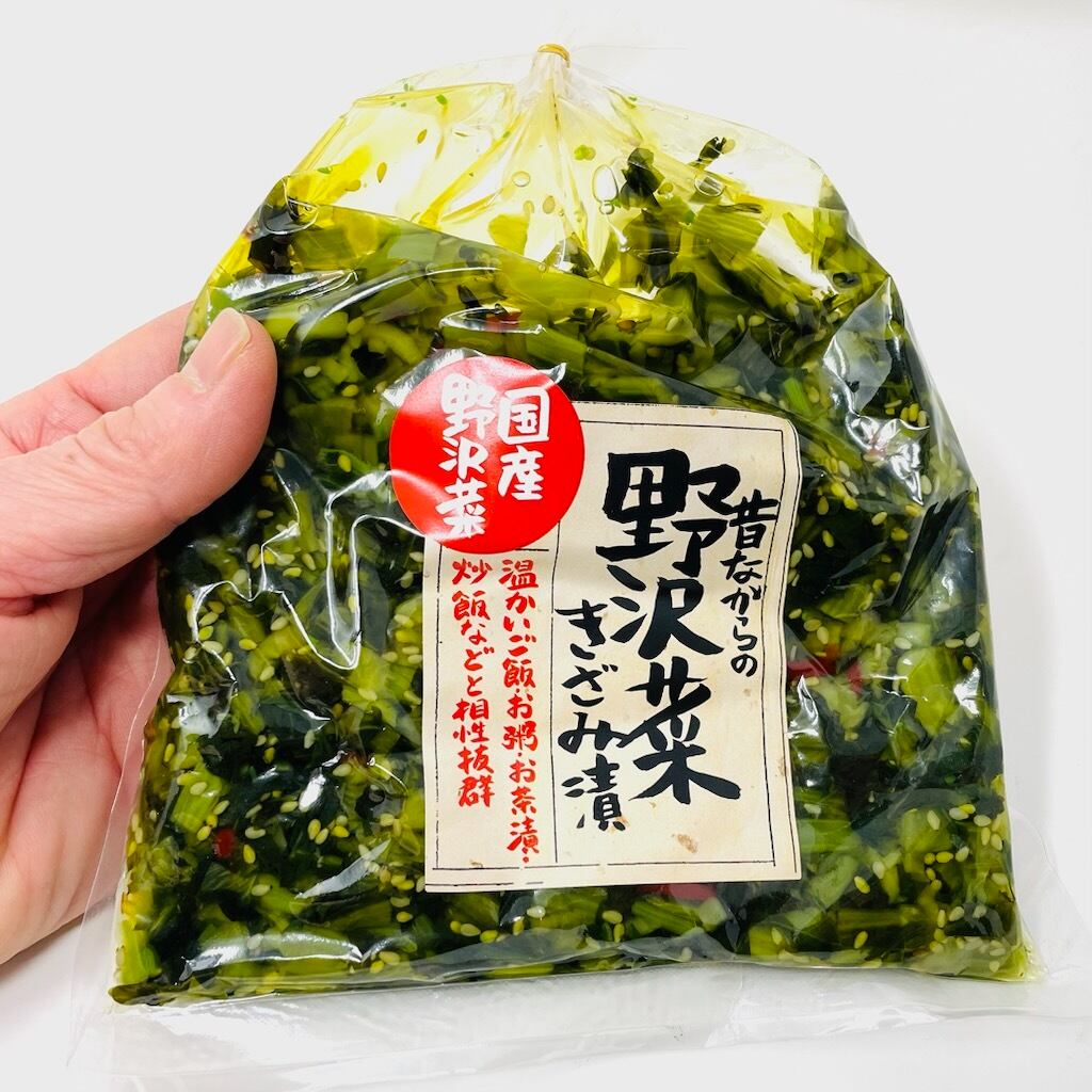 原材料名:野沢菜(国産)、大根(国産)、ごま、唐辛子、漬け原材料[アミノ酸液、醸造酢、食塩、砂糖、しょうゆ、かつおエキス]/調味料(アミノ酸等)、甘味料(ステビア)、酸味料、保存料(ソルビン酸K)、着色料、(一部に小麦、大豆を含む)