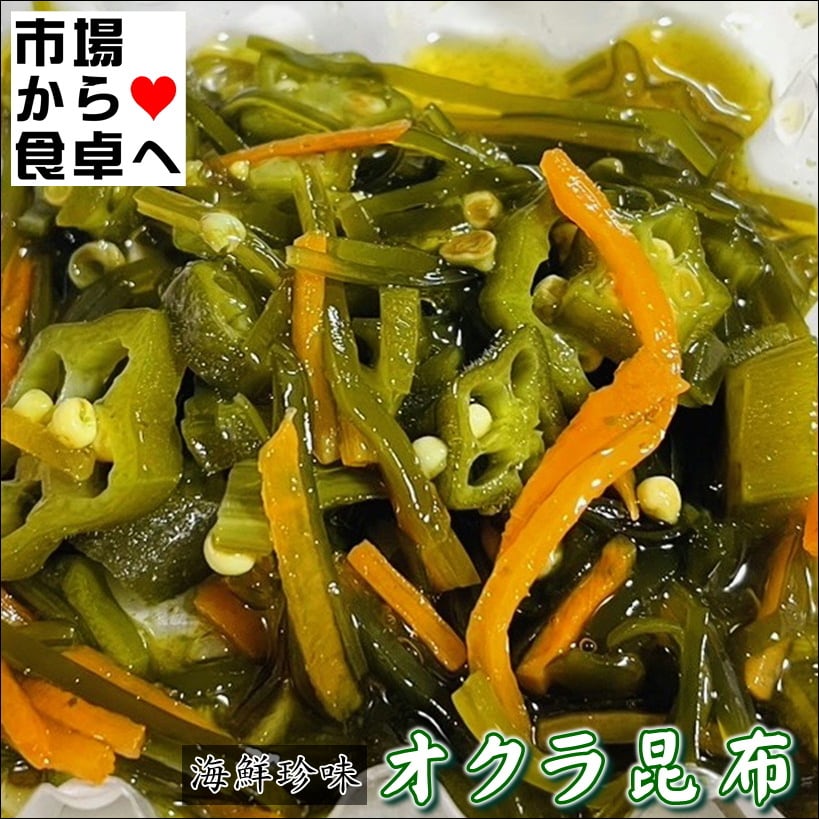 原材料名:オクラ(中国)、昆布(国産)、人参(国産)、漬け原材料(糖類(砂糖・異性化液糖)食塩、こんぶエキス調味料、アミノ酸液(大豆を含む)、かつお削りぶし(粉末)、濃縮かつお節だし、しょうゆ(小麦を含む)醸造酢かつお節風味調味料、たん白加分解物調味料)/調味料(アミノ酸液等)、酒精、着色料(カラメル、黄4青1)、酢酸Na、増粘多糖類、pH調整剤、酸味料、保存料(ソルビン酸K)、乳化剤、トウガラシ抽出物