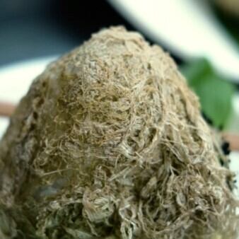 めかぶと昆布を醸造酢に漬けて薄く削りました。