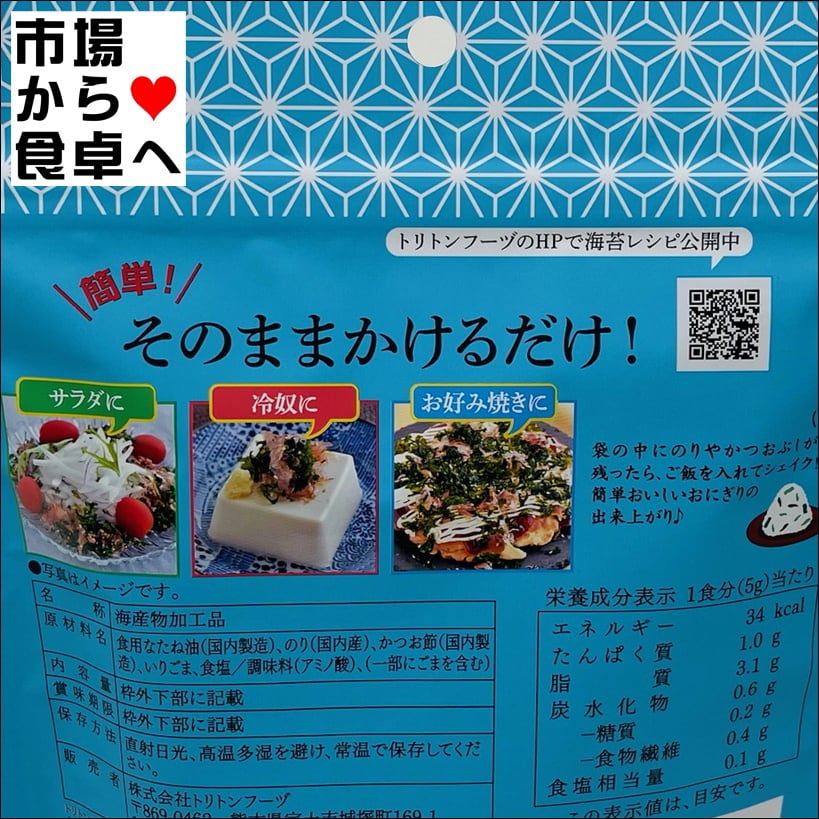 原材料名:食用なたね油(国内製造)、のり(国内産)、かつお節(国内製造)、いりごま、食塩/調味料(アミノ酸)一部にごまを含む